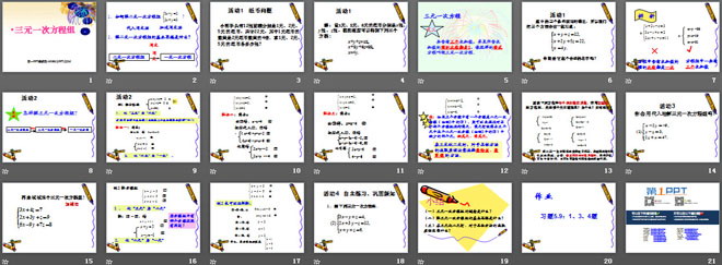 关键词:二元一次方程组课件,三元一次方程组课件,北师大版八年级上册数学PPT课件,八年级数学幻灯片课件下载,二元一次方程组PPT课件下载,三元一次方程组PPT课件下载,.ppt格式