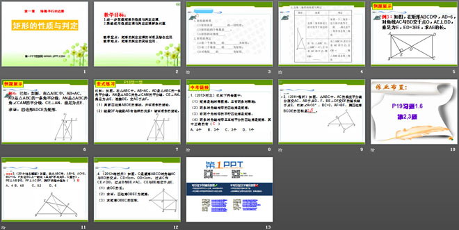 关键词:特殊平行四边形教学课件,矩形的性质与判定教学课件,北师大版九年级上册数学PPT课件,九年级数学幻灯片课件下载,特殊平行四边形PPT课件下载,矩形的性质与判定PPT课件下载,.ppt格式