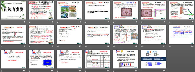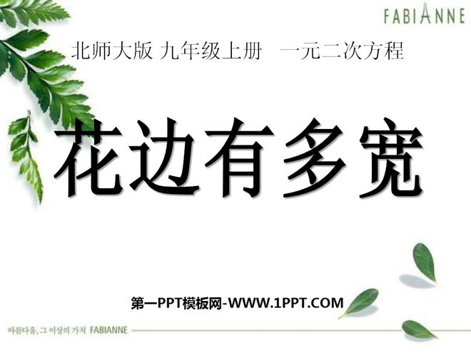 关键词:一元二次方程教学课件,花边有多宽教学课件,北师大版九年级上册数学PPT课件,九年级数学幻灯片课件下载,一元二次方程PPT课件下载,花边有多宽PPT课件下载,.ppt格式