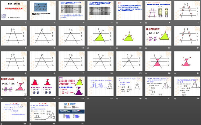 关键词:图形的相似教学课件,平行线分线段成比例教学课件,北师大版九年级上册数学PPT课件,九年级数学幻灯片课件下载,图形的相似PPT课件下载,平行线分线段成比例PPT课件下载,.ppt格式