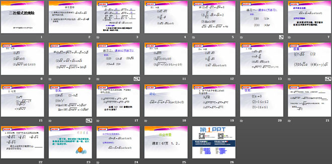 课件中含有丰富的例题,充分诠释了二次根式的定义和性质,对于难点、重点内容进行了加强,非常适合初中数学教学。