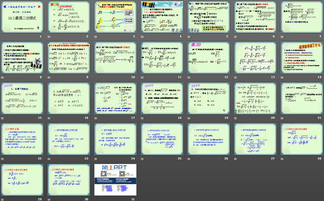 课件中含有丰富的例题,充分诠释了二次根式的定义和性质,对于难点、重点内容进行了加强,非常适合初中数学教学。