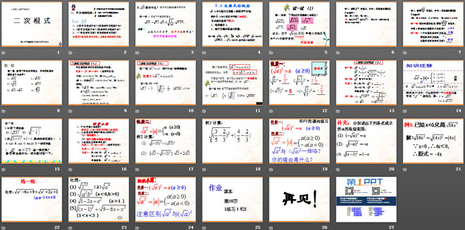 课件中含有丰富的例题,充分诠释了二次根式的定义和性质,对于难点、重点内容进行了加强,非常适合初中数学教学。
