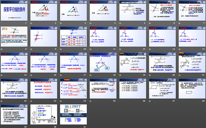 关键词:平行线与相交线教学课件,探索直线平行的条件教学课件,北师大版七年级下册数学PPT课件,七年级数学幻灯片课件下载,平行线与相交线PPT课件下载,探索直线平行的条件PPT课件下载,.ppt格式