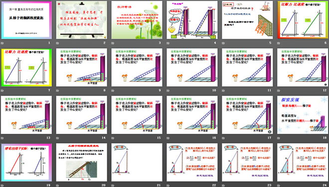 关键词:直角三角形的边角关系教学课件,从梯子的倾斜程度谈起教学课件,北师大版九年级下册数学PPT课件,九年级数学幻灯片课件下载,直角三角形的边角关系PPT课件下载,从梯子的倾斜程度谈起PPT课件下载,.ppt格式