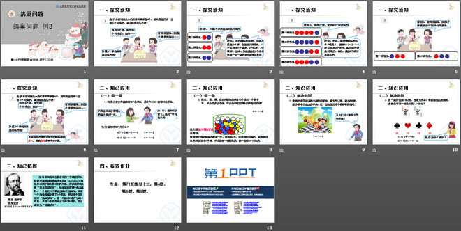 关键词:《鸽巢问题》教学课件,人教版六年级下册数学课件,六年级数学幻灯片课件下载,《鸽巢问题》PPT课件下载,.ppt格式