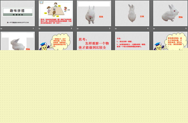 2、要观察好物体,需从不同的位置,不同的角度,进行全方位、综合的观察。