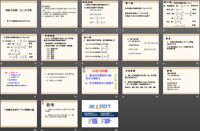关键词:用配方法解一元二次方程教学课件,青岛版九年级上册数学PPT课件下载,九年级数学幻灯片课件下载,用配方法解一元二次方程PPT课件下载,.PPT格式;