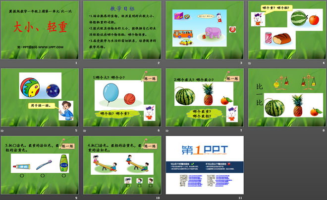 关键词:比一比教学课件,大小轻重教学课件,冀教版一年级上册数学PPT课件下载,一年级数学幻灯片课件下载,比一比PPT课件下载,大小轻重PPT课件下载,.PPT格式;