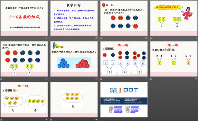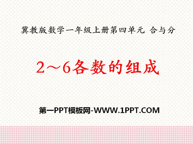 关键词:合与分教学课件,2-6各数的组成教学课件,冀教版一年级上册数学PPT课件下载,一年级数学幻灯片课件下载,合与分PPT课件下载,2-6各数的组成PPT课件下载,.PPT格式;