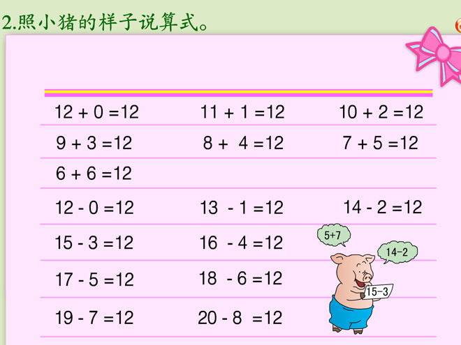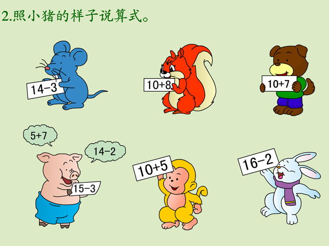 关键词:20以内的减法教学课件,照小猪的样子说算式教学课件,冀教版一年级上册数学Flash动画课件下载,一年级数学动画课件下载,20以内的减法Flash课件下载,照小猪的样子说算式Flash课件下载,.SWF格式;