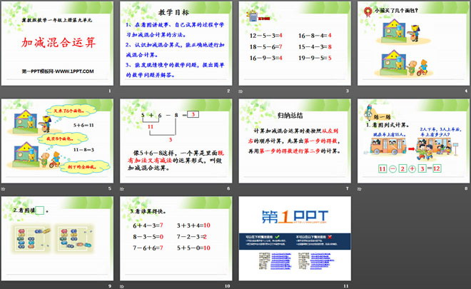 关键词:20以内的减法教学课件,加减混合运算教学课件,冀教版一年级上册数学PPT课件下载,一年级数学幻灯片课件下载,20以内的减法PPT课件下载,加减混合运算PPT课件下载,.PPT格式;