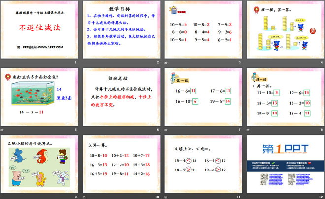 关键词:20以内的减法教学课件,不退位减法教学课件,冀教版一年级上册数学PPT课件下载,一年级数学幻灯片课件下载,20以内的减法PPT课件下载,不退位减法PPT课件下载,.PPT格式;