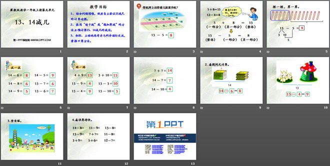 关键词:20以内的减法教学课件,1314减几教学课件,冀教版一年级上册数学PPT课件下载,一年级数学幻灯片课件下载,20以内的减法PPT课件下载,1314减几PPT课件下载,.PPT格式;