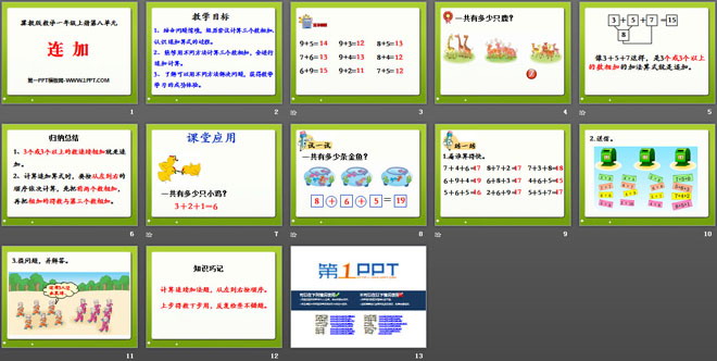 关键词:20以内的加法教学课件,连加教学课件,冀教版一年级上册数学PPT课件下载,一年级数学幻灯片课件下载,20以内的加法PPT课件下载,连加PPT课件下载,.PPT格式;