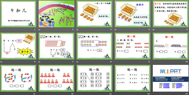 关键词:20以内的加法教学课件,9加几教学课件,冀教版一年级上册数学PPT课件下载,一年级数学幻灯片课件下载,20以内的加法PPT课件下载,9加几PPT课件下载,.PPT格式;