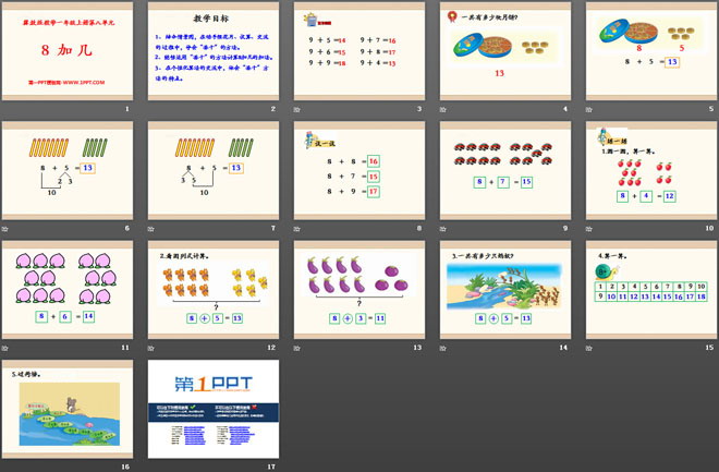 关键词:20以内的加法教学课件,8加几教学课件,冀教版一年级上册数学PPT课件下载,一年级数学幻灯片课件下载,20以内的加法PPT课件下载,8加几PPT课件下载,.PPT格式;
