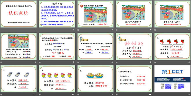 关键词:表内乘法教学课件,认识乘法教学课件,冀教版二年级上册数学PPT课件下载,二年级数学幻灯片课件下载,表内乘法PPT课件下载,认识乘法PPT课件下载,.PPT格式;