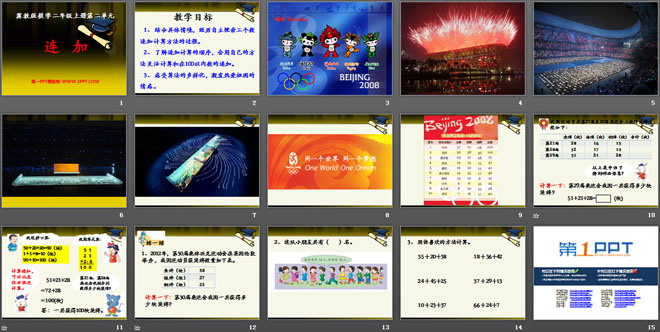 2、了解连加计算的顺序,会用自己的方法灵活计算和在100以内数的连加。