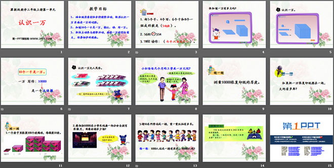 1、结合现实素材和多种数学活动,经历认识一万并感受一万的过程。