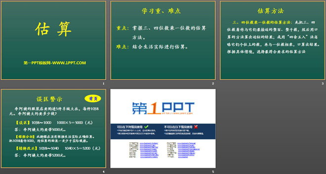 关键词:两三位数乘一位数教学课件,估算教学课件,冀教版三年级上册数学PPT课件下载,三年级数学幻灯片课件下载,两三位数乘一位数PPT课件下载,估算PPT课件下载,.PPT格式;