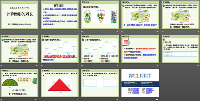 1.经历计算街上公园周长和简单图形的周长的过程。