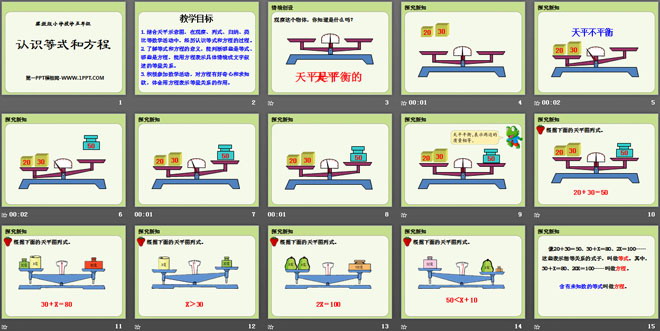 关键词:方程教学课件,认识等式和方程教学课件,冀教版五年级上册数学PPT课件下载,五年级数学幻灯片课件下载,方程PPT课件下载,认识等式和方程PPT课件下载,.PPT格式;