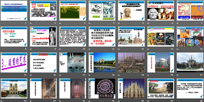 2、文学方面:古希腊的《荷马史诗》和阿拉伯的《天方夜谈》。