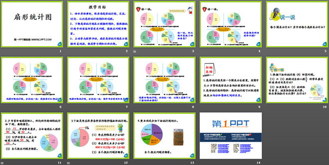 1、结合具体事例,经历读扇形统计图,交流、讨论、认识扇形统计图特征的过程。