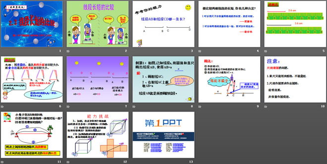 关键词:线段长短的比较教学课件,冀教版七年级上册数学PPT课件下载,七年级数学幻灯片课件下载,线段长短的比较PPT课件下载,.PPT格式;