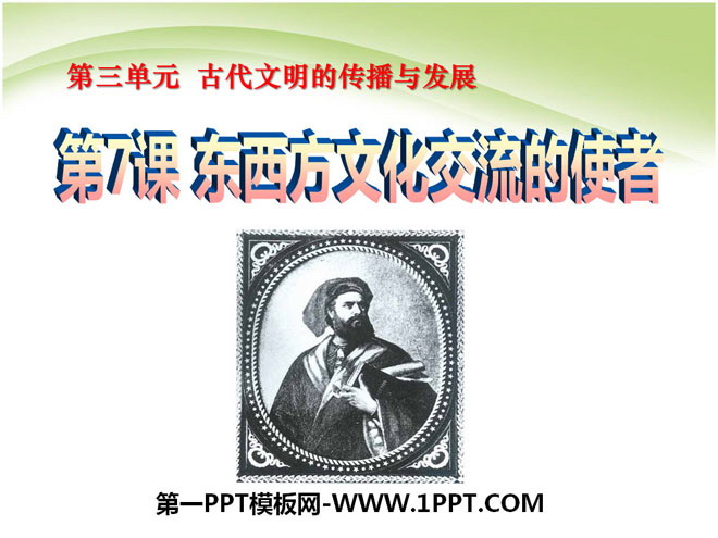 关键词:古代文明的传播与发展教学课件,东西方文化交流的使者教学课件,人教版九年级上册历史PPT课件下载,九年级历史幻灯片课件下载,古代文明的传播与发展PPT课件下载,东西方文化交流的使者PPT课件下载,.PPT格式;