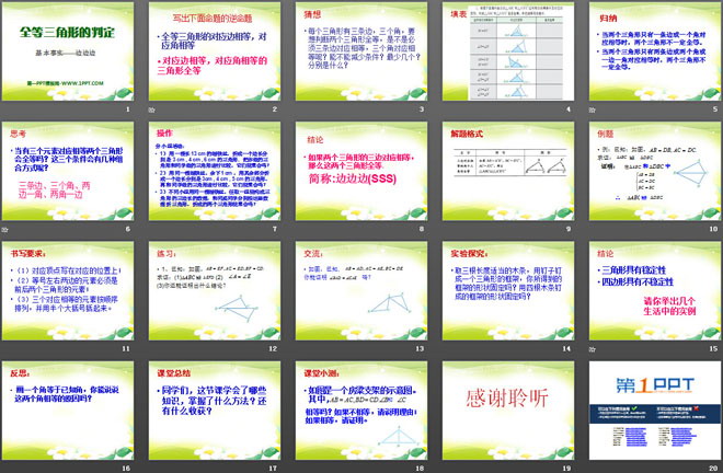 关键词:全等三角形的判定教学课件,冀教版八年级上册数学PPT课件下载,八年级数学幻灯片课件下载,全等三角形的判定PPT课件下载,.PPT格式;