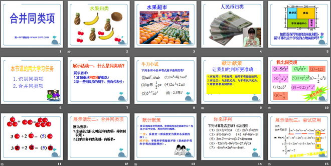 关键词:合并同类项教学课件,冀教版七年级上册数学PPT课件下载,七年级数学幻灯片课件下载,合并同类项PPT课件下载,.PPT格式;