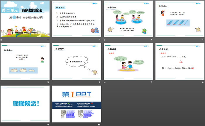 关键词:冀教版二年级下册数学PPT课件免费下载,有余数除法的认识PPT下载,.PPT格式;