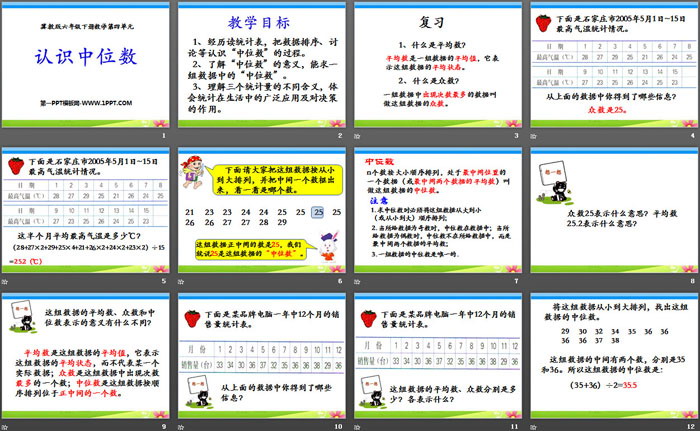 关键词:冀教版六年级下册数学PPT课件免费下载,认识中位数PPT下载,.PPT格式;