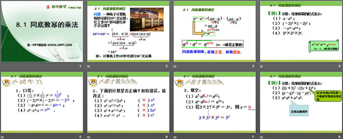 关键词:冀教版七年级下册数学PPT课件免费下载,同底数幂的乘法PPT下载,.PPT格式;