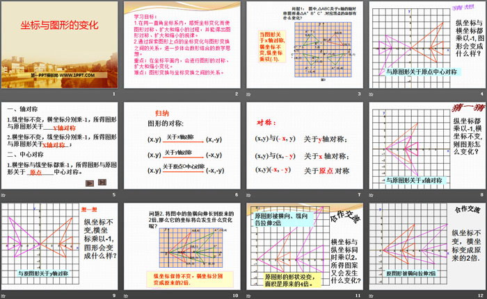 1.在同一直角坐标系内,感受坐标变化而使图形对称、扩大和缩小的过程,并能得出图形对称、扩大和缩小的规律。