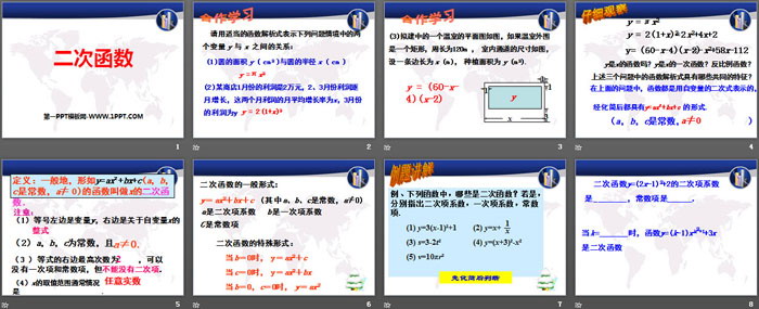 在上面的问题中,函数都是用自变量的二次式表示的,经化简后都具有y=ax²+bx+c 的形式.