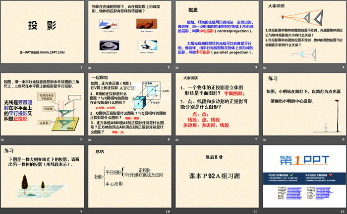 太阳光线和探照灯的光线可以看做是平行的。像这样,由平行光线照射在物体上所形成的投影,叫做平行投影(parallet projection).