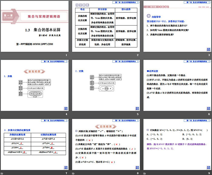 关键词:高中人教A版数学必修一PPT课件免费下载,集合的基本运算PPT下载,集合与常用逻辑用语PPT下载,.PPT格式;