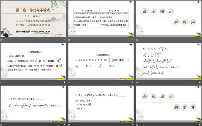 关键词:高中人教B版数学必修一PPT课件免费下载,均值不等式及其应用PPT下载,等式与不等式PPT下载,均值不等式的应用PPT下载,.PPT格式;