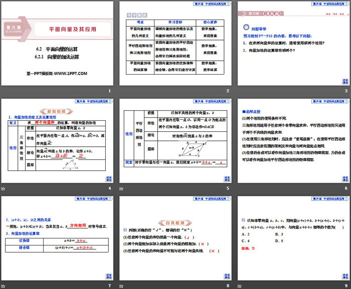 关键词:高中人教A版数学必修二PPT课件免费下载,平面向量的运算PPT下载,平面向量及其应用PPT下载,向量的加法运算PPT下载,.PPT格式;