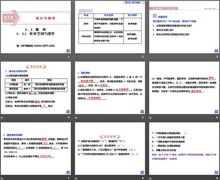 关键词:高中人教B版数学必修二PPT课件免费下载,概率PPT下载,统计与概率PPT下载,样本空间与事件PPT下载,.PPT格式;