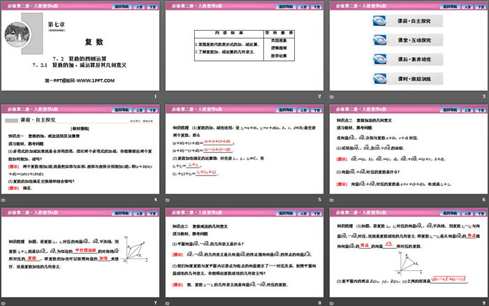关键词:高中人教A版数学必修二PPT课件免费下载,复数的四则运算PPT下载,复数PPT下载,复数的加减运算及其几何意义PPT下载,.PPT格式;