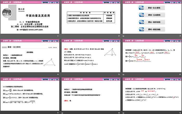 关键词:高中人教A版数学必修二PPT课件免费下载,平面向量的应用PPT下载,平面向量及其应用PPT下载,正弦定理和余弦定理的综合应用PPT下载,.PPT格式;