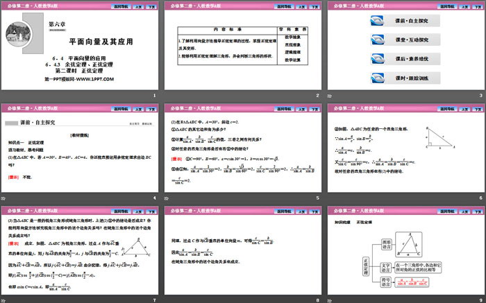 关键词:高中人教A版数学必修二PPT课件免费下载,平面向量的应用PPT下载,平面向量及其应用PPT下载,正弦定理PPT下载,.PPT格式;