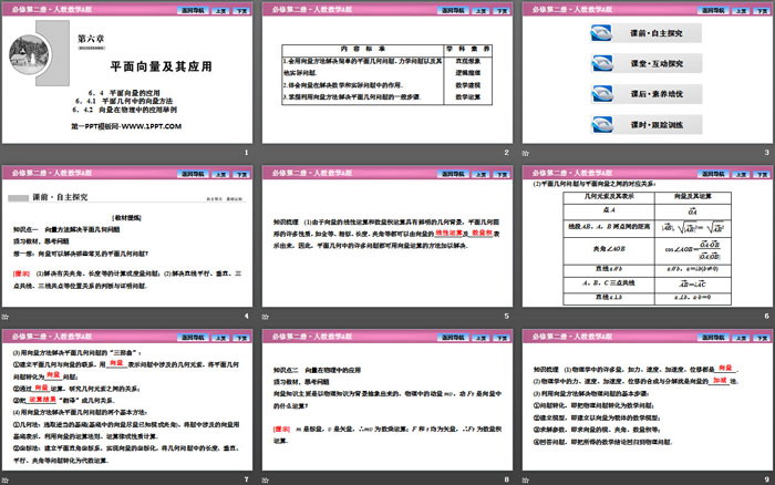 关键词:高中人教A版数学必修二PPT课件免费下载,平面向量的应用PPT下载,平面向量及其应用PPT下载,平面几何中的向量方法PPT下载,向量在物理中的应用举例PPT下载,.PPT格式;