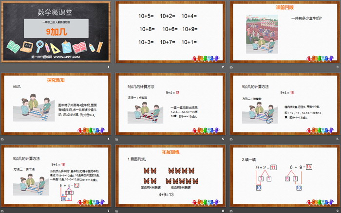 关键词:人教版一年级上册数学PPT课件免费下载,9加几PPT下载,20以内的进位加法PPT下载,.PPT格式;