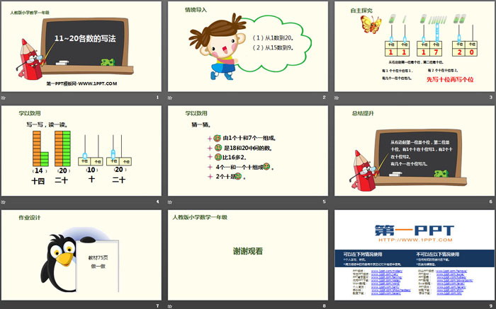 关键词:人教版一年级上册数学PPT课件免费下载,11-20各数的写法PPT下载,11-20各数的认识PPT下载,.PPT格式;