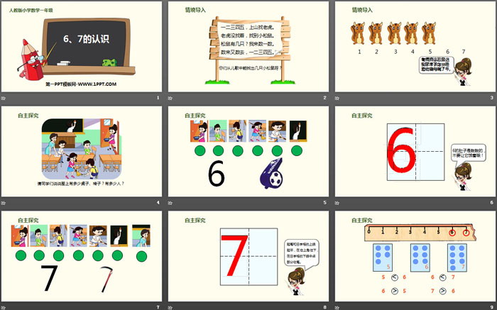 关键词:人教版一年级上册数学PPT课件免费下载,6、7的认识PPT下载,6-10的认识和加减法PPT下载,6和7PPT下载,.PPT格式;